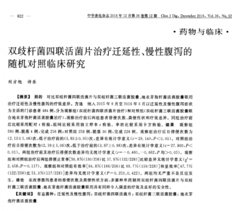 双歧杆菌四联活菌片和双歧杆菌三联活菌胶囊与地衣芽孢杆菌活菌胶囊联用疗效相同,但在患者依从性方面具有优势。本研究对照组出现了较高的 病例脱落率(11.6%),而观察组脱落率仅1.5%。对照组脱落病例的主要原因为漏服、错服,说明单药治疗依从性更好。